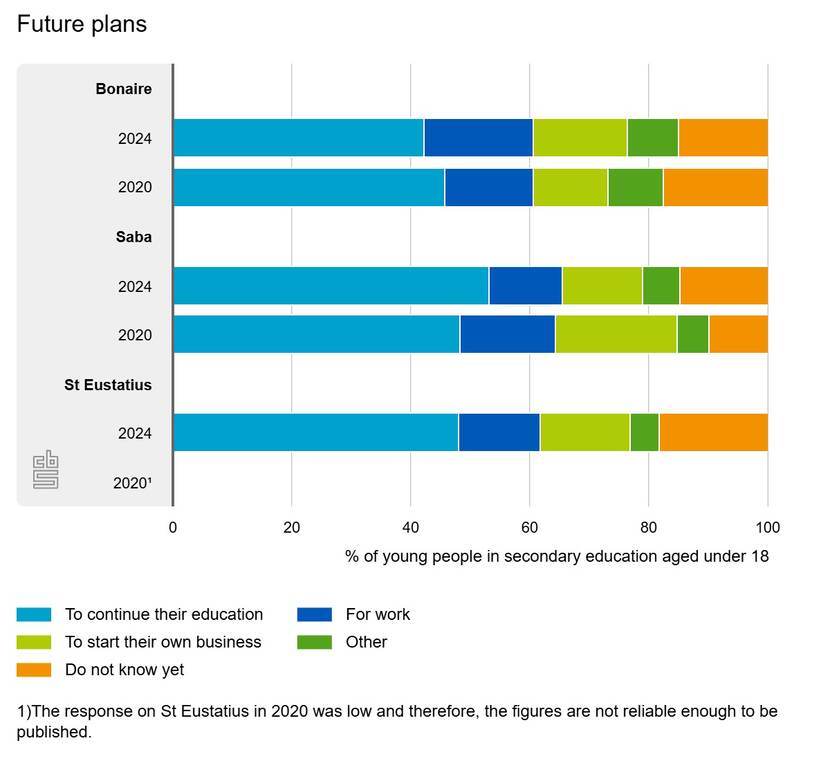 Among school students on Bonaire aged under 18 in secondary education, 42 percent want to continue their education, but this will mean leaving the island. Among students on Saba and St Eustatius, the percentage was 53 percent and 48 percent, respectively. The majority of the students who intend to remain on the islands want to find a job or start their own business. A minority indicate that they do not know yet.