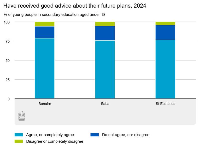 Making plans for the future and moving to another country are major decisions, and good advice can help young people to make the right choices. In 2024, 79 percent of students on Bonaire agreed with the statement ‘I have received good advice about making plans for my future’. The percentages for Saba and St Eustatius were almost the same. On all three islands, 5 percent or less disagreed with the statement.