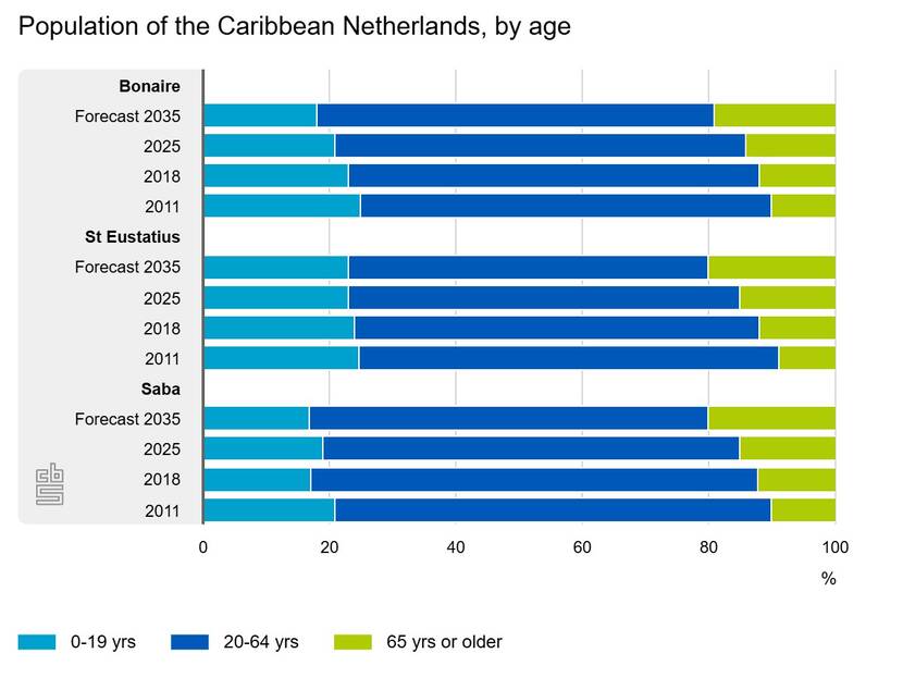 On Saba, 21 percent of the population was aged under 20 in 2011. That is expected to be 17 percent in 2035.