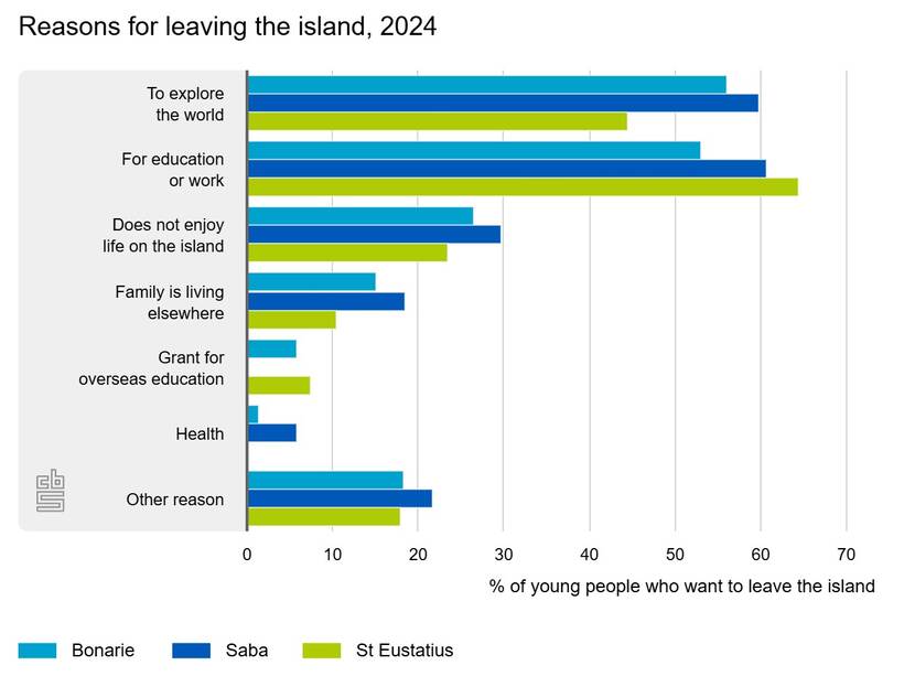 In 2024, 91 percent of students on Saba and St Eustatius aged under 18 in secondary (vocational) education said they want to leave the island and live elsewhere. On Bonaire, the share was 81 percent. A total of 56 percent of school students on Bonaire who plan to leave the island said they want to travel and explore other countries. On Saba, the share was nearly 60 percent and on St Eustatius it was 45 percent.