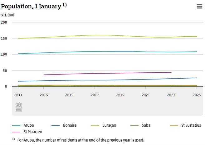 The Caribbean part of the Kingdom has more than 330 thousand inhabitants in 2025. Curaçao has the largest population of any of the islands with 156 thousand residents, followed by Aruba with 108 thousand. St Maarten had a population of 43 thousand in 2023, according to the latest figures.