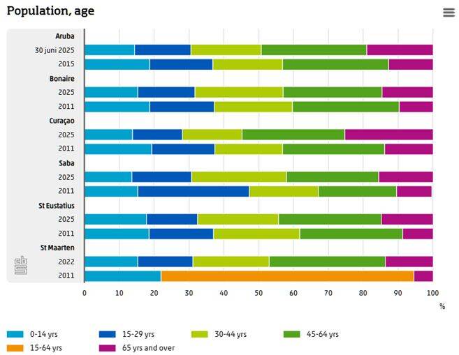 The population of all the islands is ageing more rapidly, particularly Curaçao. A quarter of its population is now aged 65 years or older. In 2011, this was under 14 percent. In the Caribbean Netherlands, the number of seniors is much lower: around 15 percent of the population is aged 65 years or older. In 2011, the share was 10 percent.