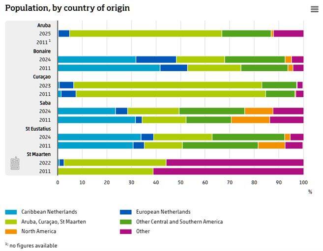 On Bonaire, the share of residents born on the island fell from 42 percent in 2011 to 30 percent in 2025. The share of residents born in the European Netherlands rose from 11 percent to 17 percent, and the share of residents born in South and Central America increased from 19 percent to 26 percent.